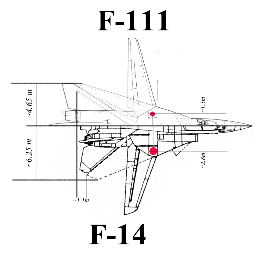 نمودار مهم: برای درک پیوستگی طراحی این نمودار اف-111 را با اف-14 مقایسه می کند. شباهت شان شگفت انگیز است. راه حل طراحان، دورترکردن مفصل بال متحرک(قرمز) ازمحورتقارن بدنه،برای افزایش مساحت قسمت ثابت بال وکم کردن پسای تریم ناشی از عقب رفتگی زیاد بال اف111ب در پرواز مافوق صوت بود/۱۰