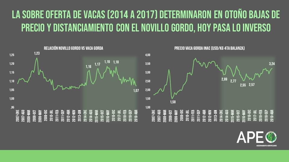 (2/5) En este otoño 2019 el precio de la vaca ha variado su relación con el novillo gordo indicando tal vez que la demanda supera la oferta. Del 2014 al 2017 sucedió lo contrario, bajo precio y distanciamiento con el novillo.