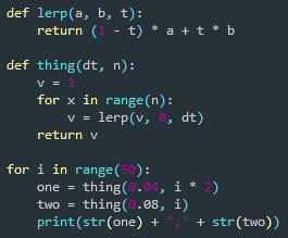 @beachgrub @Jonathan_Blow @cmuratori It's a useful smoothing method for when you have a moving target, and you want it to move there faster when further away, and slow down when it's closing in for instance, making a thing smoothly follow your cursor thing.pos = lerp( thing.pos, mousePos, c * dt )
