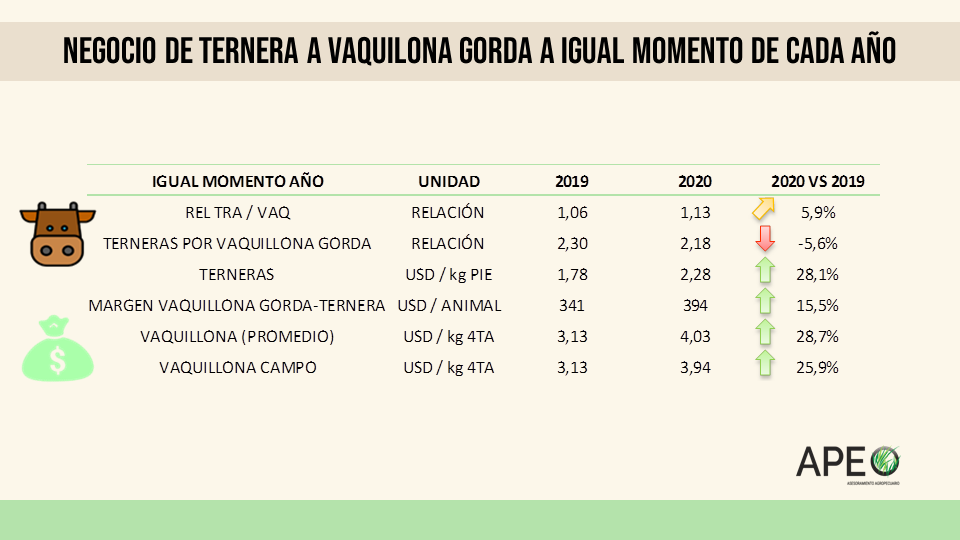 #MonitorAPEO El negocio de tra a vaquillona gorda tuvo una mejora del 15% en el año. La valorización de la ternera (28%) fue casi igual al de la vaquillona gorda, a diferencia de lo que ocurrió con tro a nov donde el novillo se valorizó unos 8 puntos % más que el ternero. 3/3