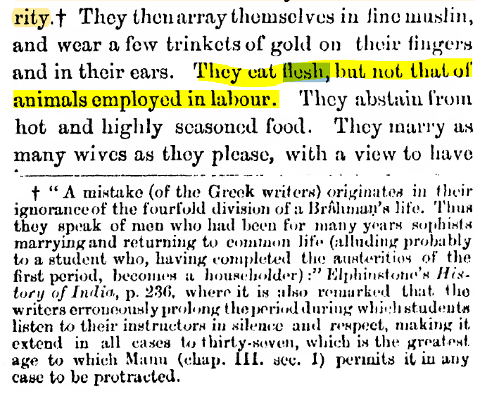 @VedicWisdom1 Even Magasthenese mentioned that Brahamans did not eat flesh for animals employed in labour. He meant animals domesticated for field work, milk were not eaten. Else where he mentions that only hunted animals (deers, etc.) were eaten that too by people on hills.
