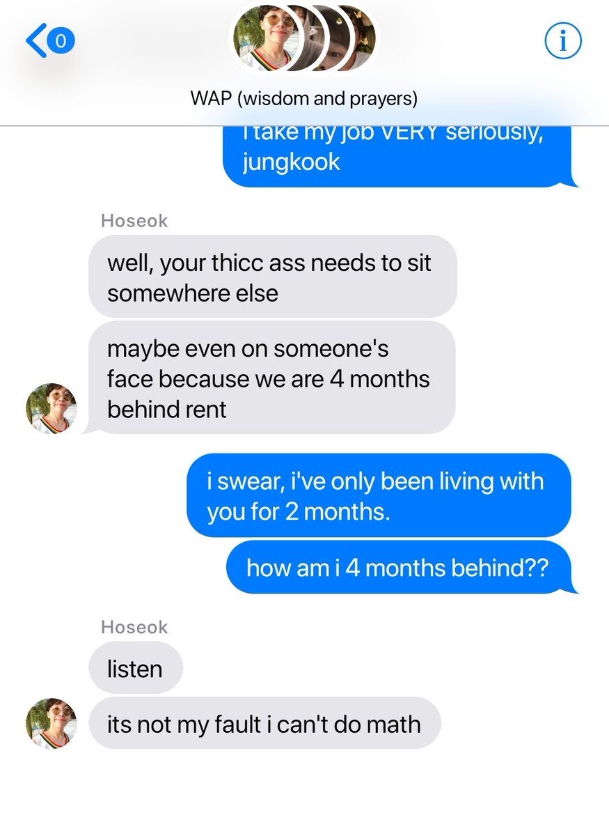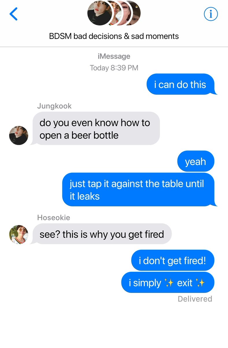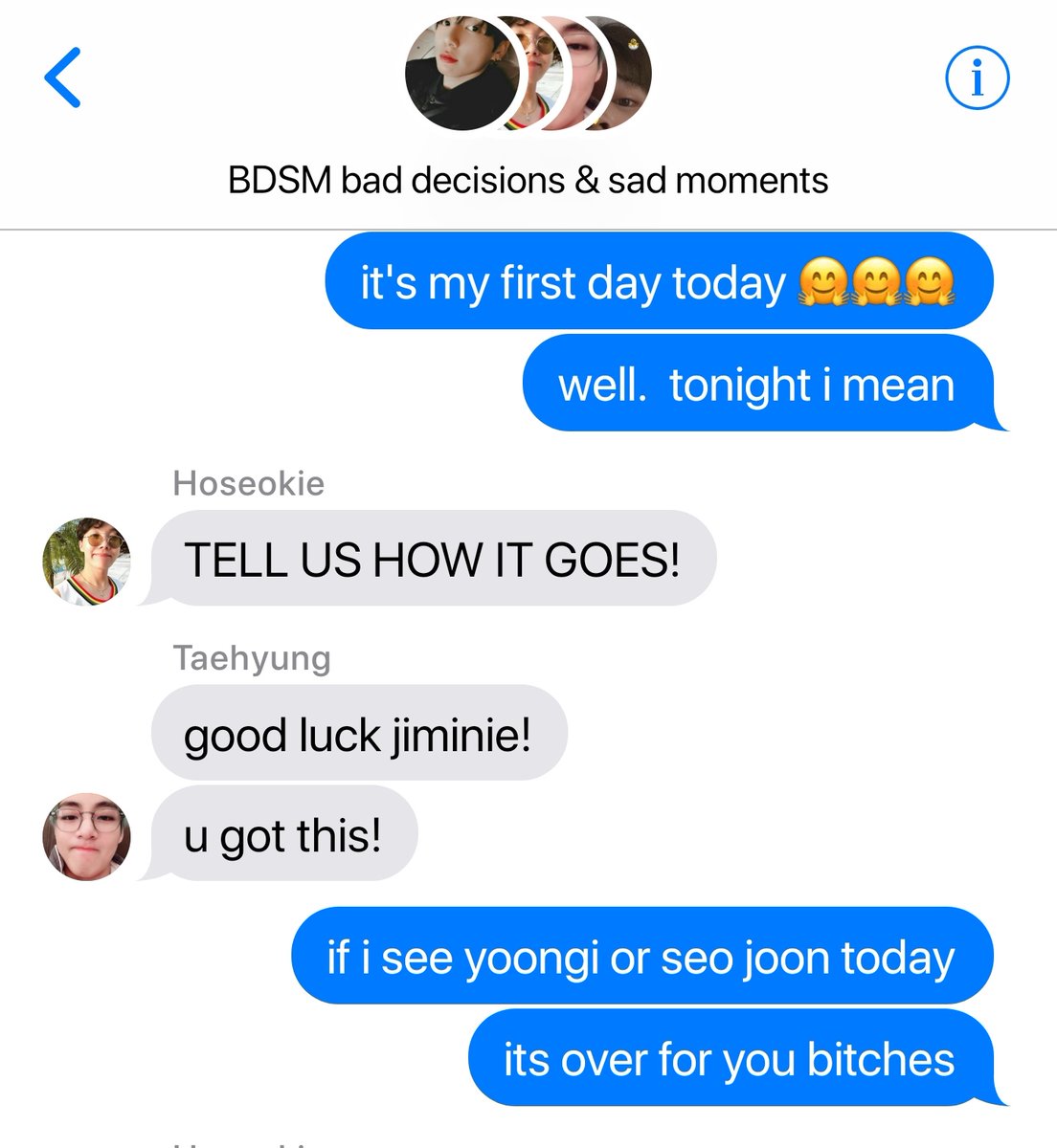 Jimin nods "Yeah, it's actually my first night!" The blond smiles, "I could tell" he pushes his drink back to Jimin, "This tastes like shit" Jimin's eyes went wide. He did not expect that. His smile turned to confusion. "Excuse me?" "I said the drink you made tastes like shit"
