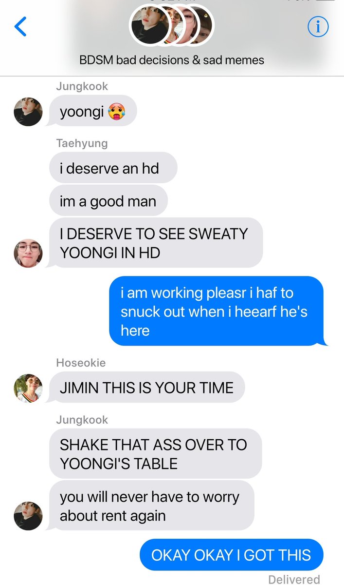 The blond has his back leaning against the counter, facing the dance floor. This dude definitely cut in line, but Jimin isn't questioning it anymore. "Hey, what can I get you?" The blond turns to him and Jimin felt his blood rushing up his head. Oh my god. It's Min Yoongi!