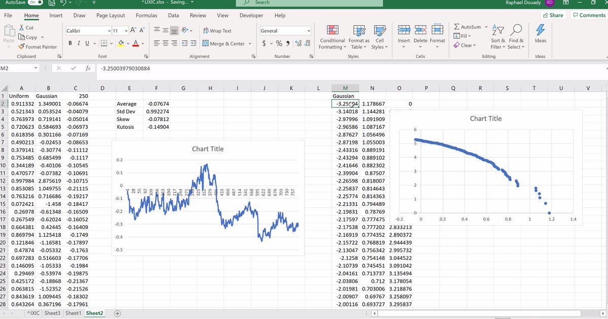 Raphaël plots kurtosis before we will do a short break. @NonMeek asks him how would this look with a normal distribution. Raphaël plays with the data and comes up with the graph in the right. The distribution of the kurtosis is itself skewed, and it often goes negative. 14/n