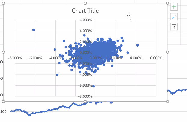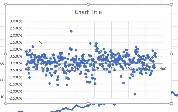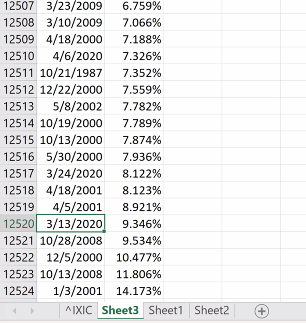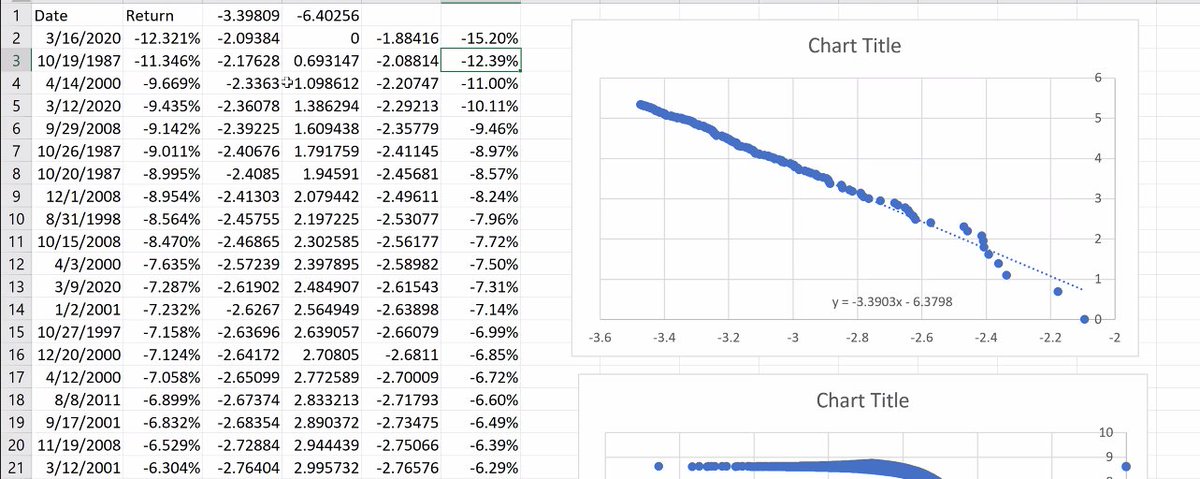 I column is std deviation, J ratio of J2 and J3. Log return scales well even with variations like 1987 Black Monday. The Russian Market had a 95% drop in the 90s. Blue plots actual returns, orange log returns. At -100% it goes to infinity, on the upside almost opposite. 11/n