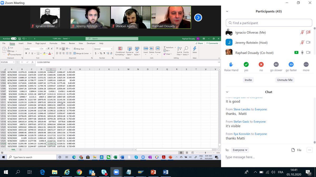 Patrice shows as a short clip of the SP500 evolution, Raphaël comments that for the SP500 returns and log returns don't make a big difference. 30/n