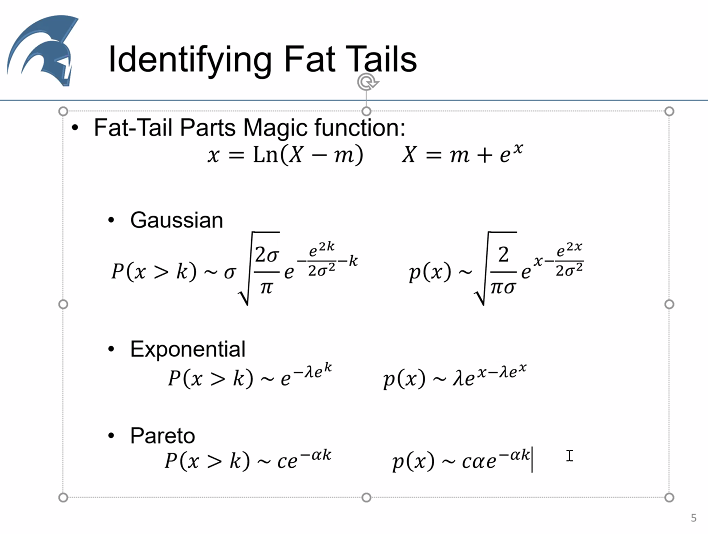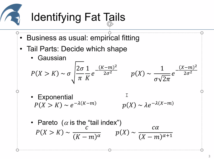 Identifying Fat Tails. Here the distributions we should know, these function explains how the probability decays. NNT found an alpha below 1 when he was studying wars: it is difficult to understand phenomenon with no average. 15/n