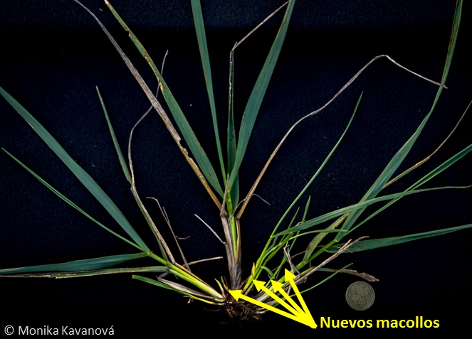 3/6 Tenemos que cambiar el chip, comenzar a relajar la protección que dimos a los macollos durante el verano, y enfocarmos en estimular el macollaje. Así reemplazamos los macollos muertos. Cuando la base de las plantas muestra esto ↓, nos indica que "ya pasó lo peor del verano"
