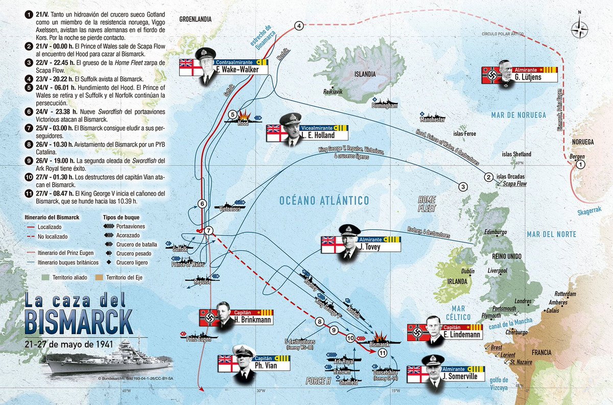 WWII en Twitter 26-Mayo-1941 EL BISMARCK ES HERIDO DE MUERTE A la noche,tras ser localizado por un destructor polaco q comunica la posición del Bismarck a la flota🇬🇧,el 🚢🇩🇪empieza a recibir ataques por parte d destructores🇬🇧y✈️ d los portaaviones🇬🇧.Una bomba le atascó el timón⬇️