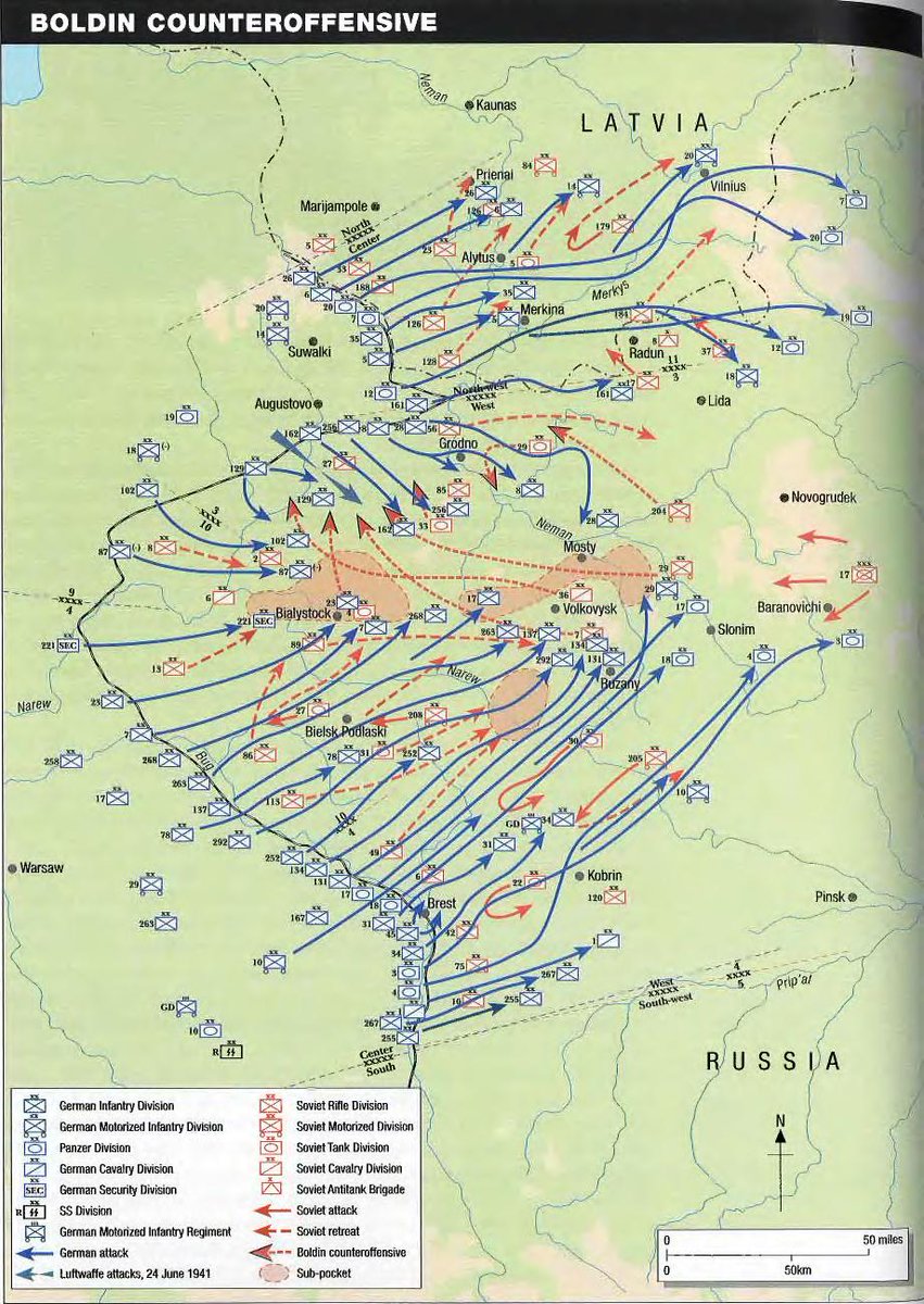 WWII en Twitter 29-Junio-1941 La Wehrmacht cierra la bolsa d Minsk,logrando rodear a tres ejércitos soviéticos en dos bolsas,una con el 10ºEjército alrededor d Białystok y otra cn el 3º y 13ºEjército alrededor d Novogrudok.En total,420.000💂soviéticos son rodeados en su interior.
