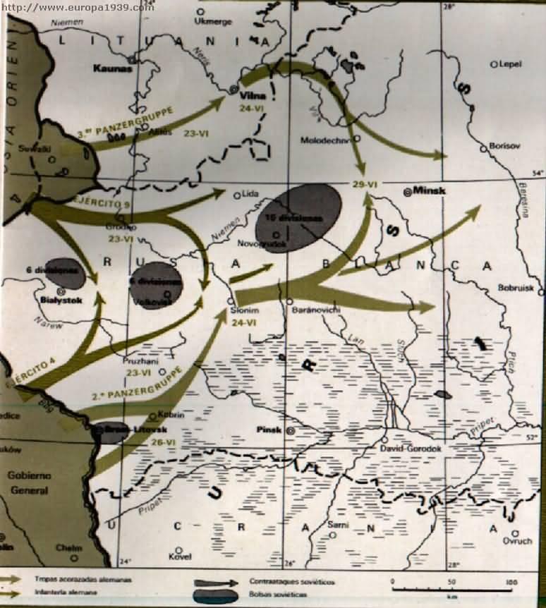 WWII en Twitter 26-Junio-1941 El grupo dl Ejército🇩🇪dl Centro crea un saliente y rodea a dos ejércitos soviéticos en Minsk. En cambio el Grupo d Ejércitos Sur encuentra+resistencia por parte d los soviéticos. La fuerza aérea rusa comienza a bombardear áreas civiles como Varsovia.