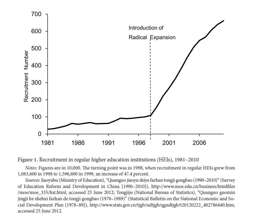 In the end, top CCP leaders listened to economists over education experts. They formulated decision over just about 3 months, then gave unis about 3 months notice that they'd be radically expanding recruitment, which shot up 47% year on year that fall. https://www.tandfonline.com/do...