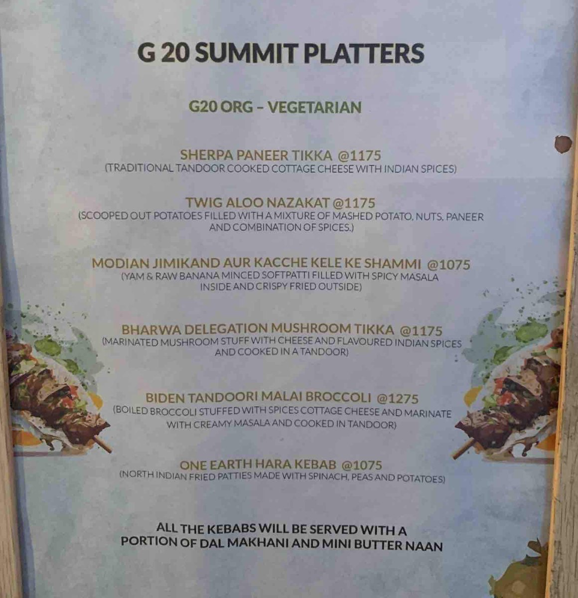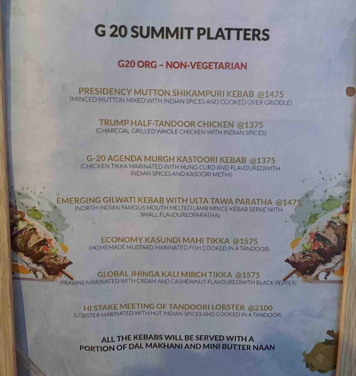 The G-20 Summit dinner platter menu is here. A lot of Kebab and Tikka stuff. And a proper Non Veg menu to accompany the Veg menu. Atleast the leaders won’t be angry tomorrow.