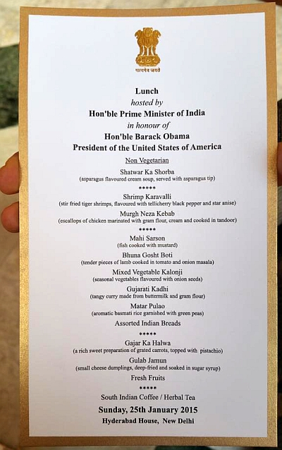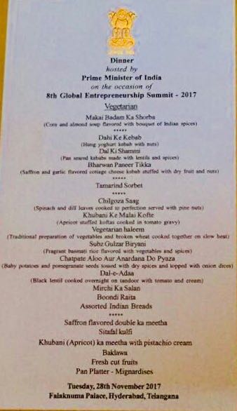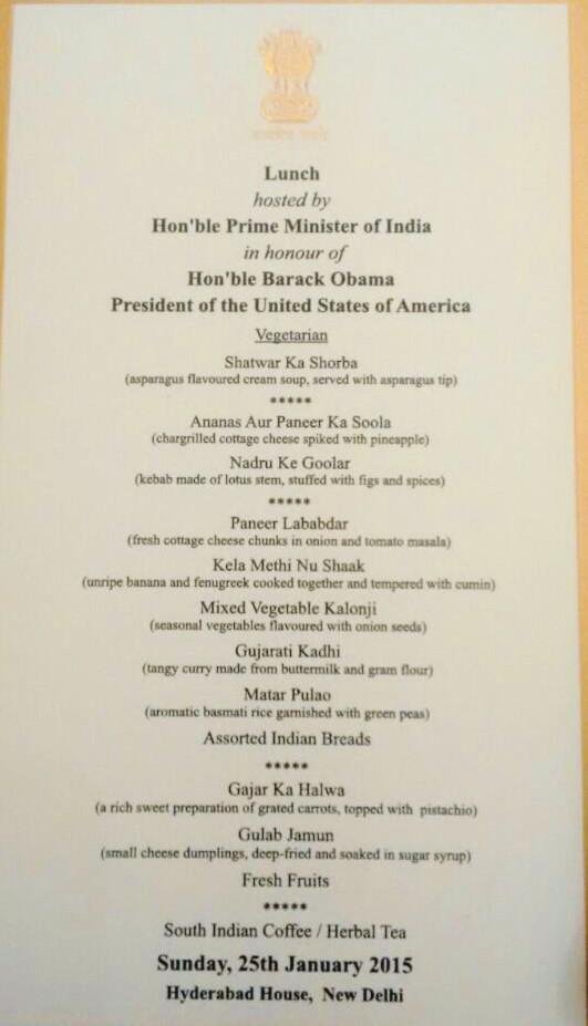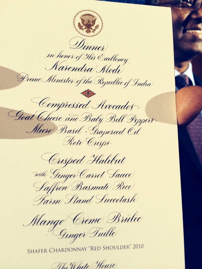 In comparison Obama’s White House dinner menu when hosting Modi back in 2014 in his first visit as PM to the US. Goat Cheese and Baby Bell peppers and compressed avocados sound interesting.