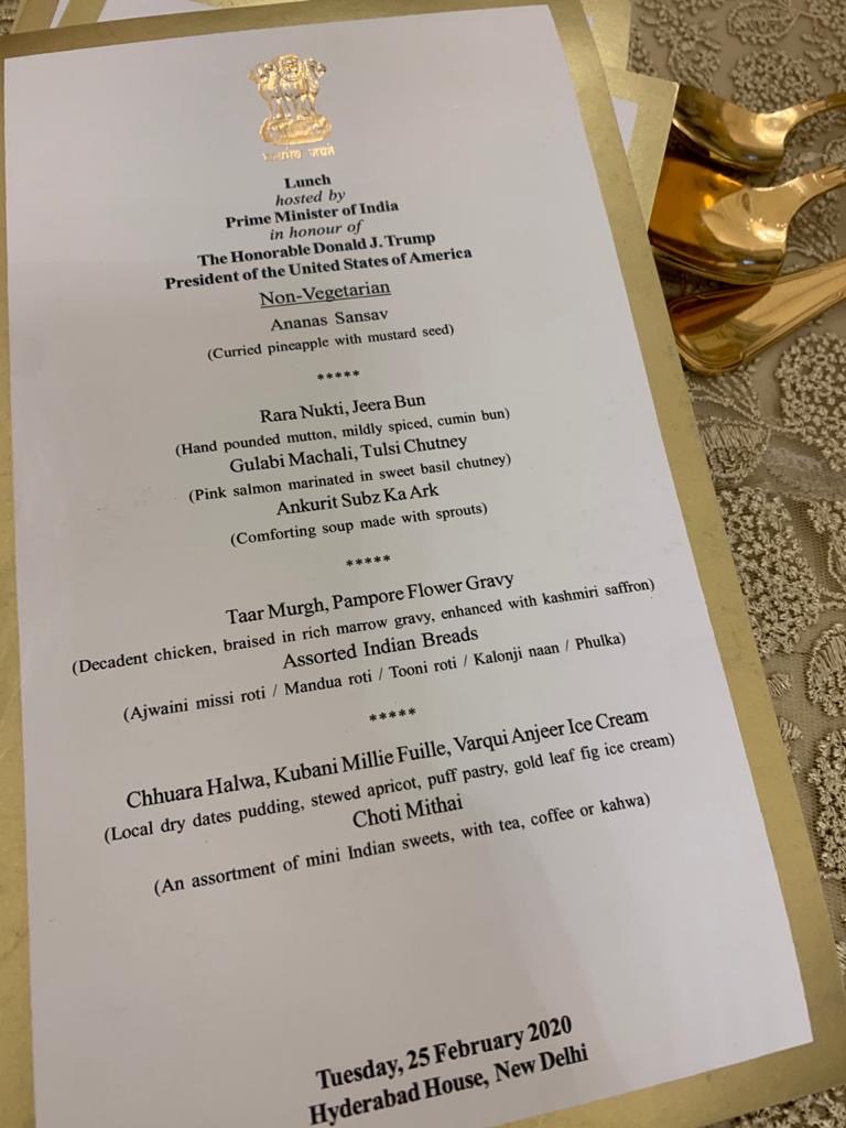 This one is for the lunch for Trump. Gold leaf fig ice cream, dry dates pudding, Panch phoron kathal(jackfruit with 5 spices). How do they come up with these?! Overall a small menu though!