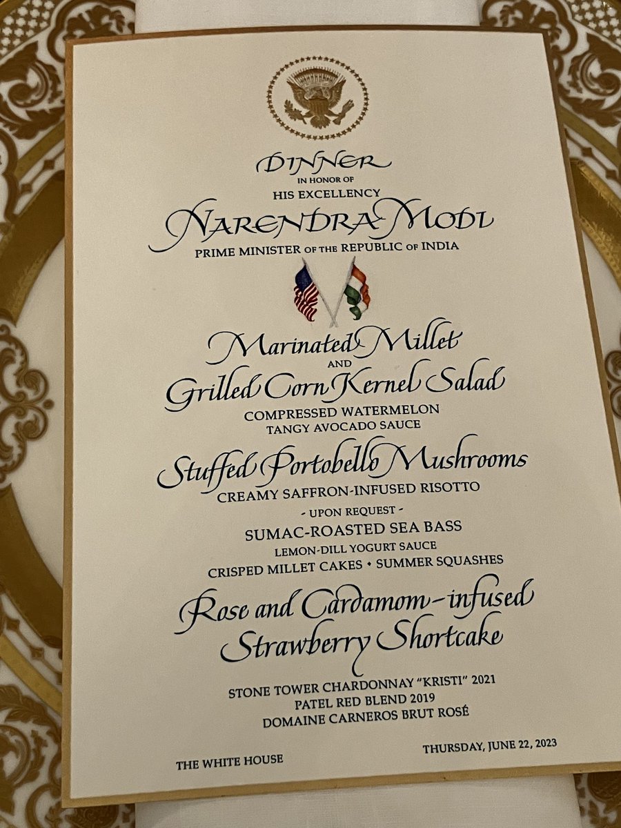 Taking a shift. Here’s the White House State Dinner hosted by Jill and Joe Biden for Narendra Modi with an all Vegetarian millets based menu.