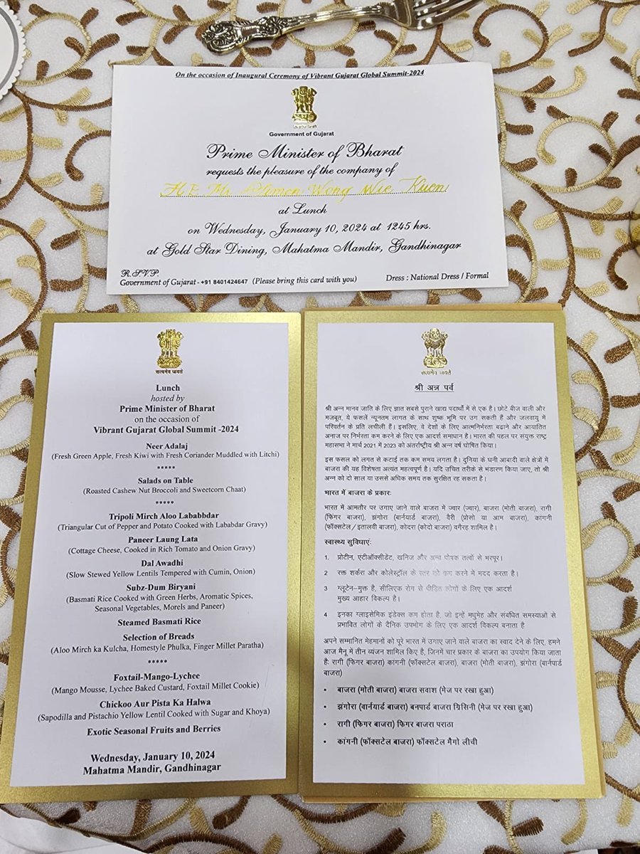 This is a standard fare menu for the Lunch hosted by Modi for the Third Summit of the Forum for India-Pacific Islands Cooperation. Millet Biriyani sounds interesting. What is this Rajasthani Ragi Gatta curry?