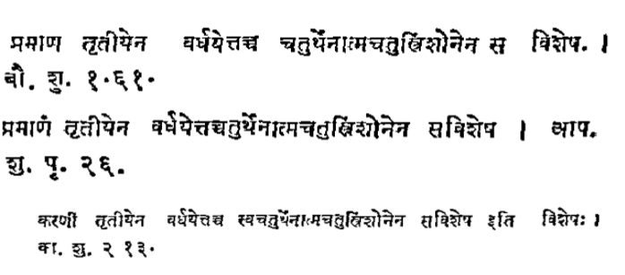 20/N: The above mentioned sutras say: One should increase the measure (of the side of the square whose double producer is to be found) by its third part & again by fourth part of this third less by the thirty fourth part of this fourth. The value obtained is called savishesa
