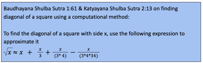 21/N: As an example, let us assume a square of 8 units on each side. According to the approximation method outlined in Shulba Sutra, the length of the diagonal L1 is given by L1 = 8 + (8/3) + ( 8 / (3 * 4)) - (8 / (3 * 4 * 34)) = 11.3137254902