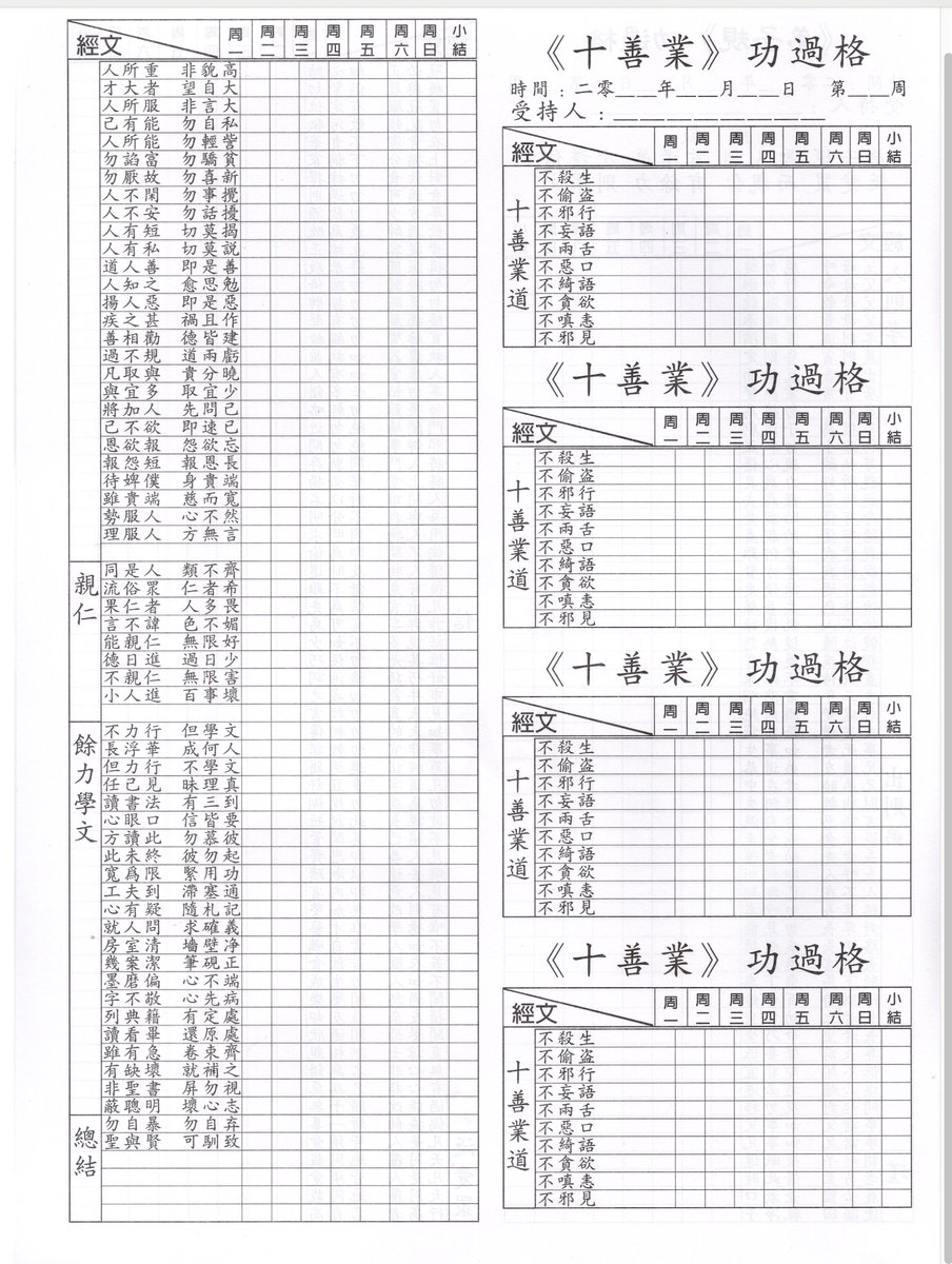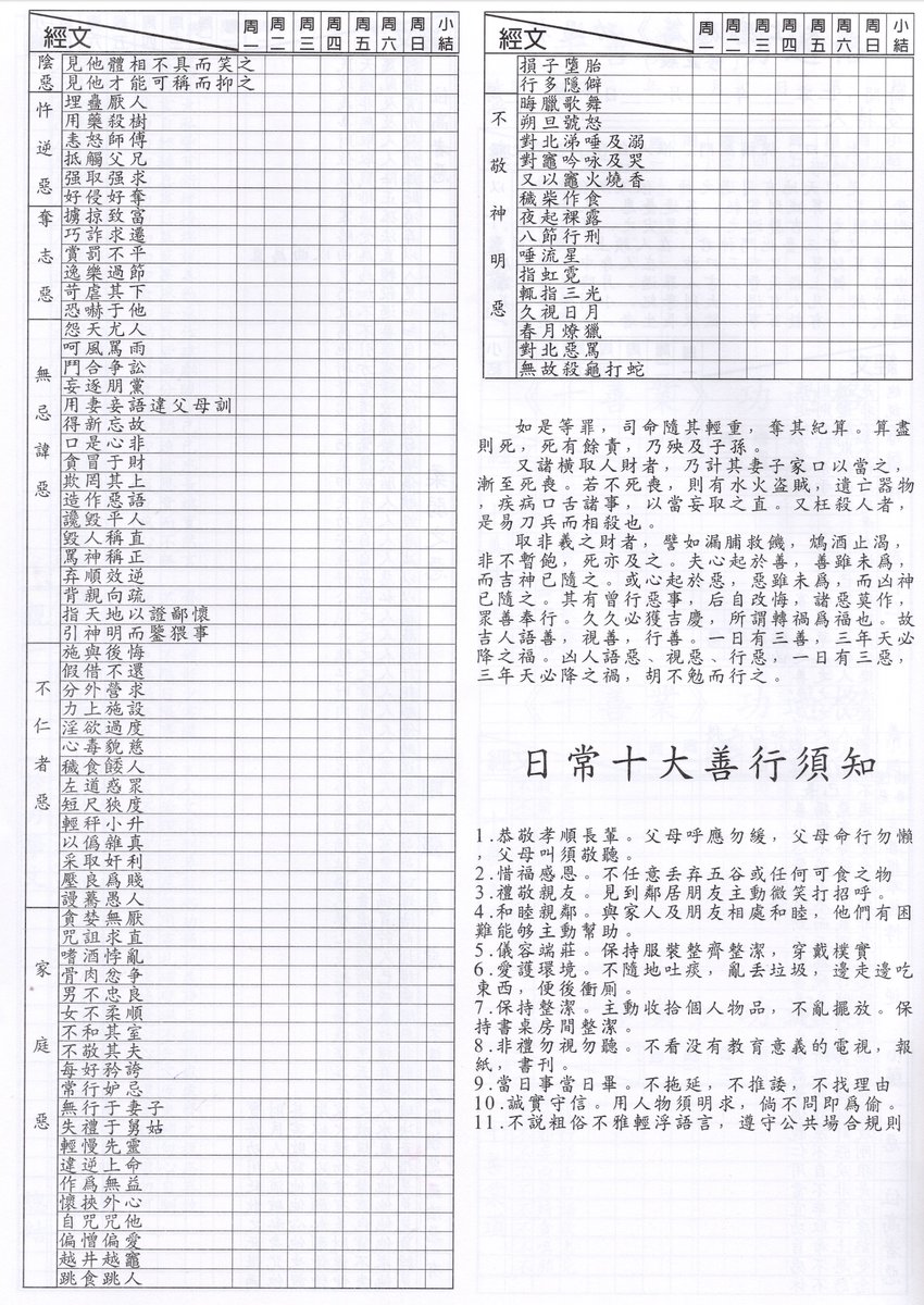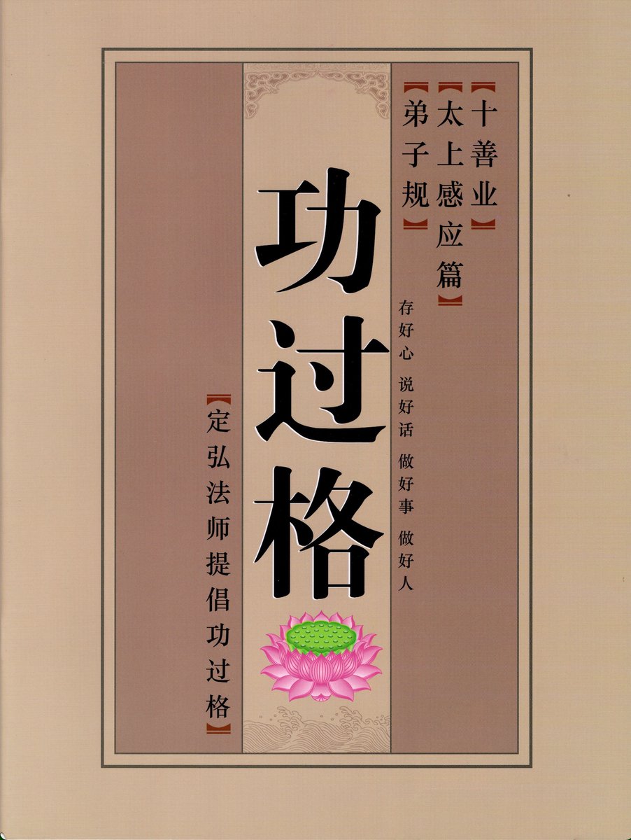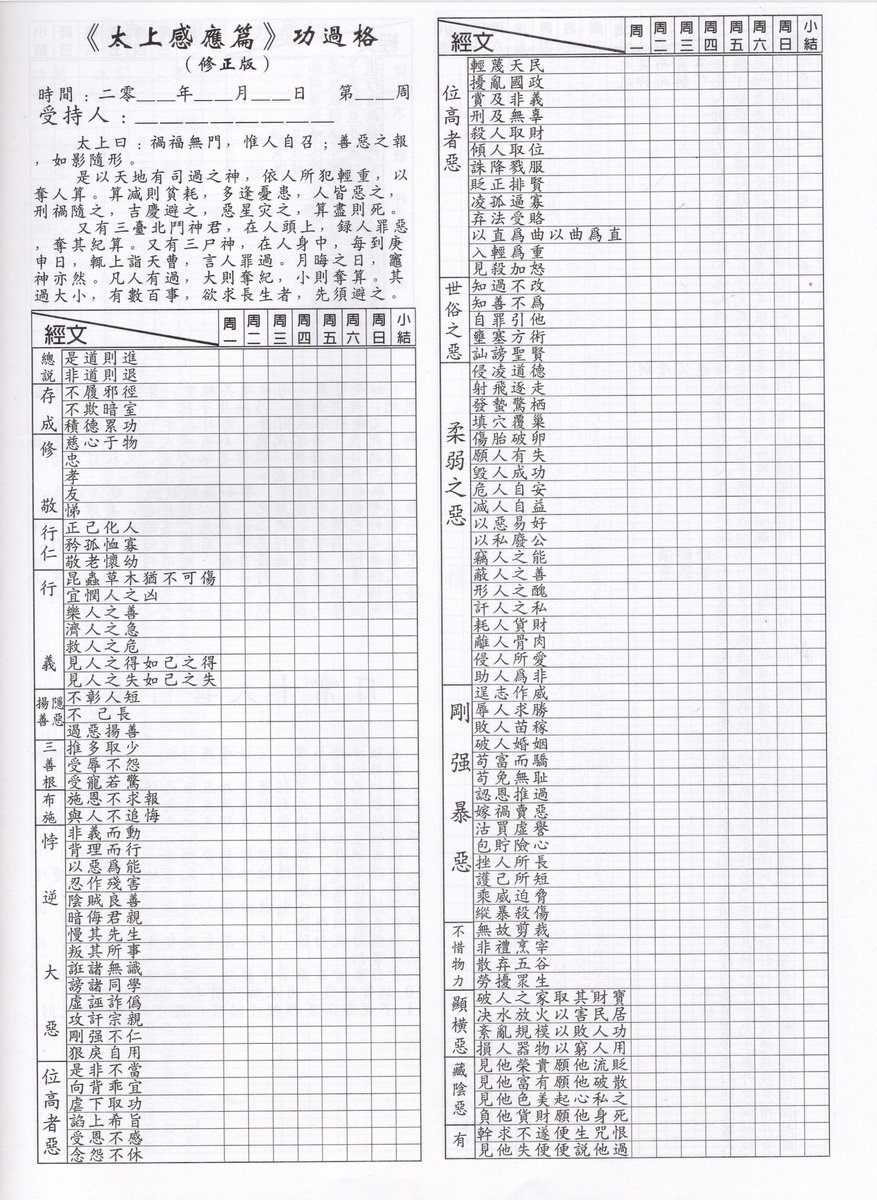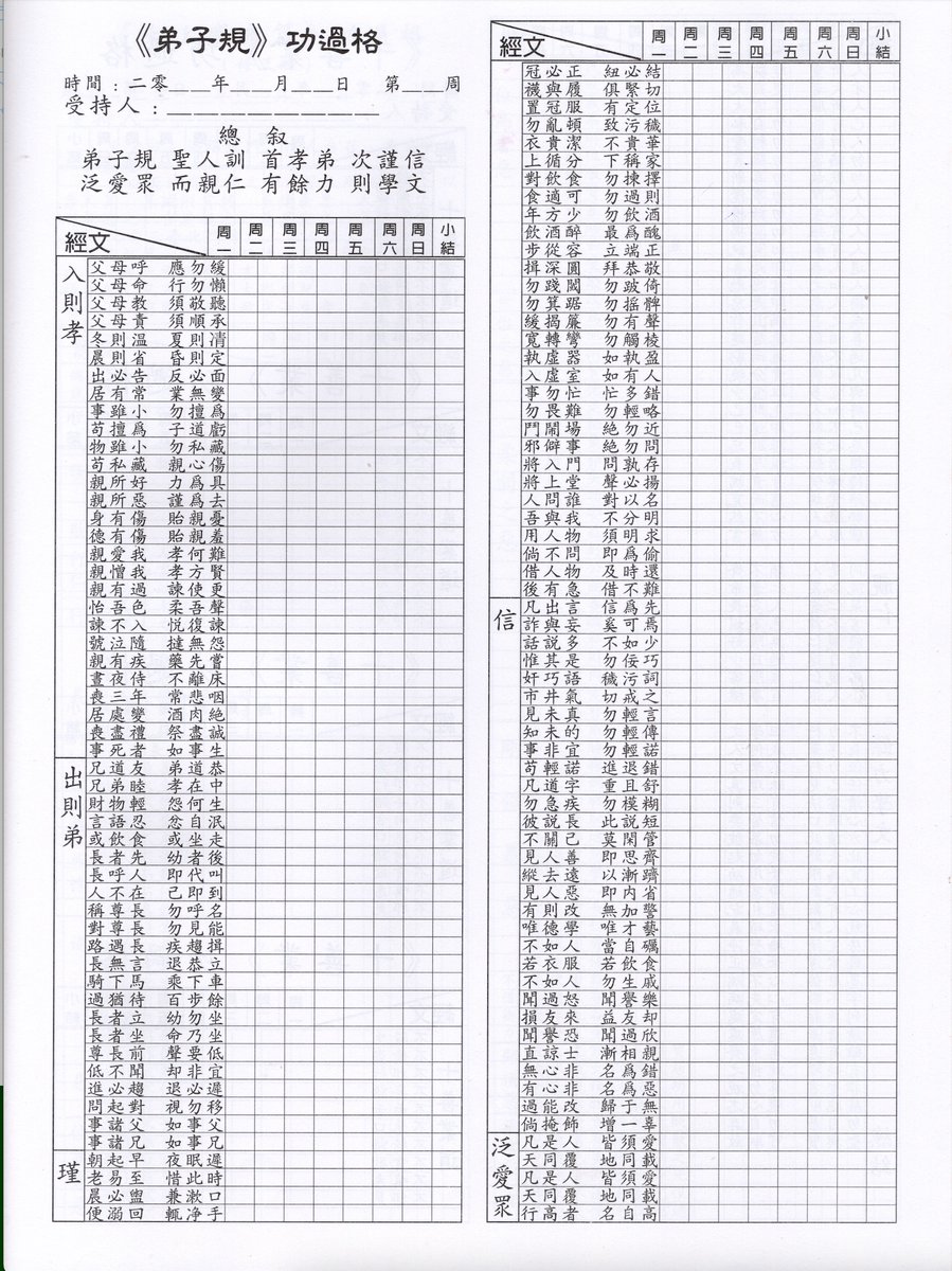 功过格 Ledger of Merits and Demerits This book is the a recent iteration of an ancient Chinese genre: ledgers wherein the user may record their meritorious and unmeritorious actions, so that they may reflect on them. This book has 3 such tables The first is based on the 弟子规