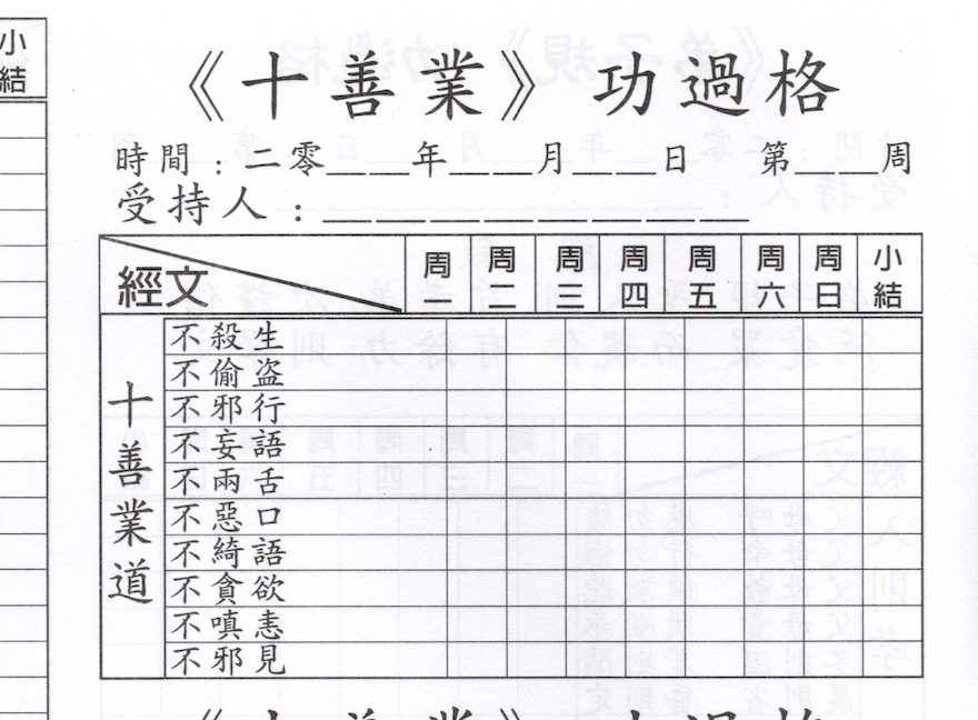 How this works can be best explained using the 10 meritorious deeds grid. Each grid contains 8 columns, one for each day of the week & the 8th for a total There are 10 good actions, viz not killing, not stealing, not lying (etc) So,if you did not kill any living creature...