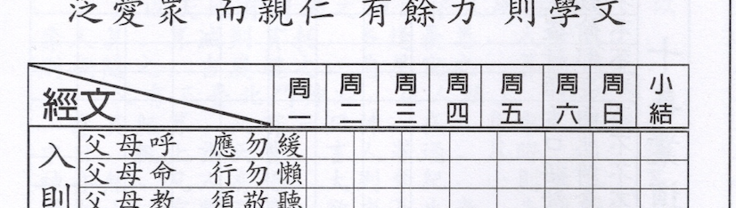 In the case of the Dizi Gui section, the entire text of the Dizi gui https://en.wikipedia.org/wiki/... is reproduced in the leftmost col. Eg the 1st line reads "When parents call, answer at once".presumably if your parents called & you and did answer at once, then you can fill in the grid