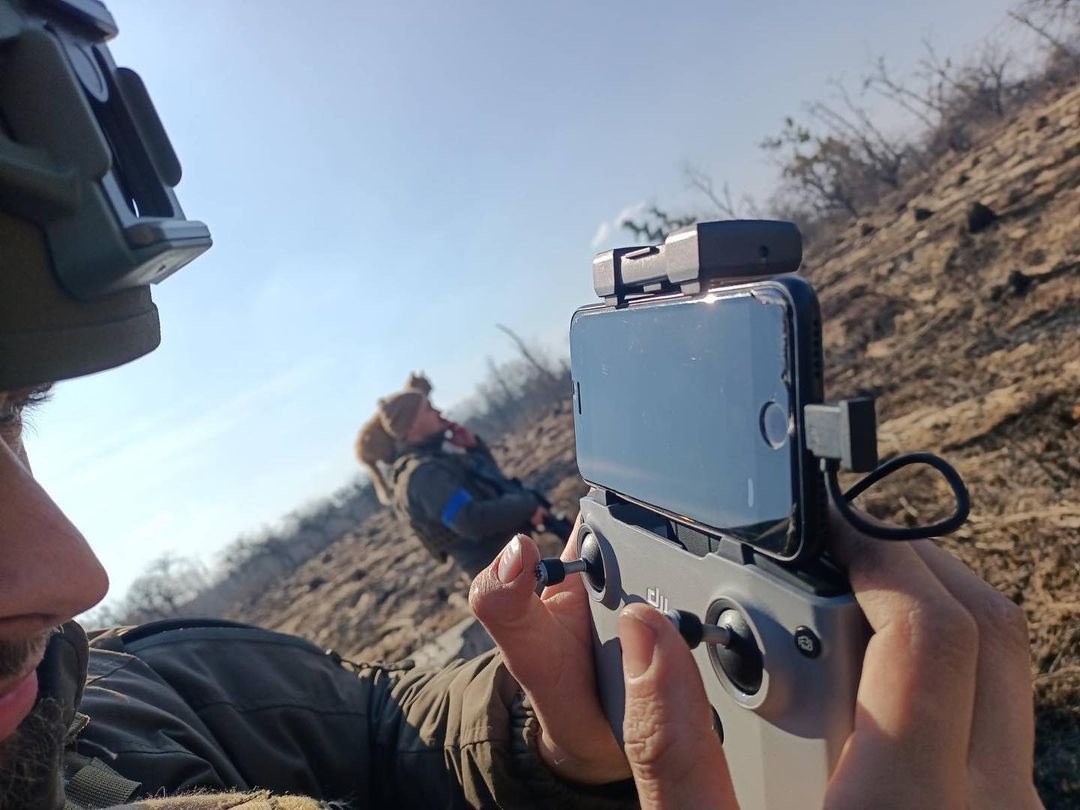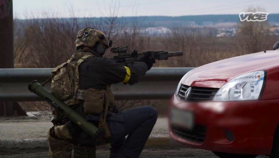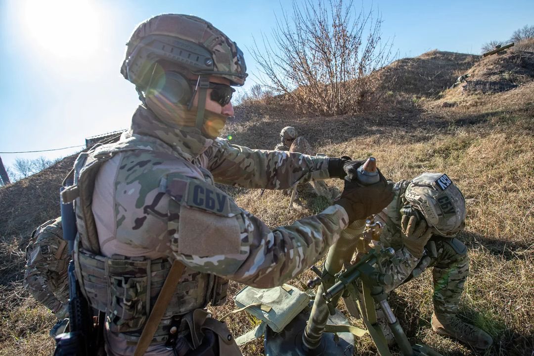 SBU Alpha (notice the Trijicon ACOG), a SNIPEX Alligator 14.5mm sniper rifle, and two members of "Avangard" unit with a commercial drone