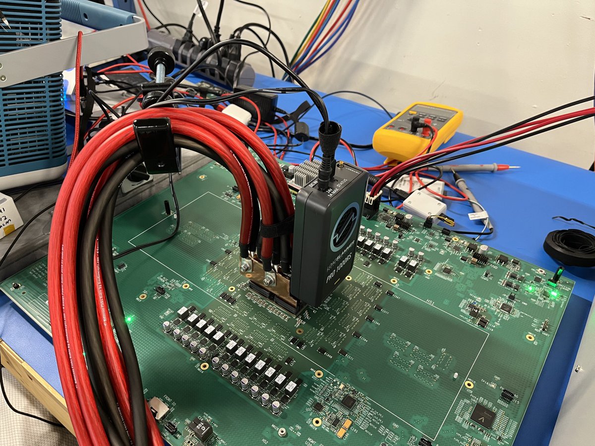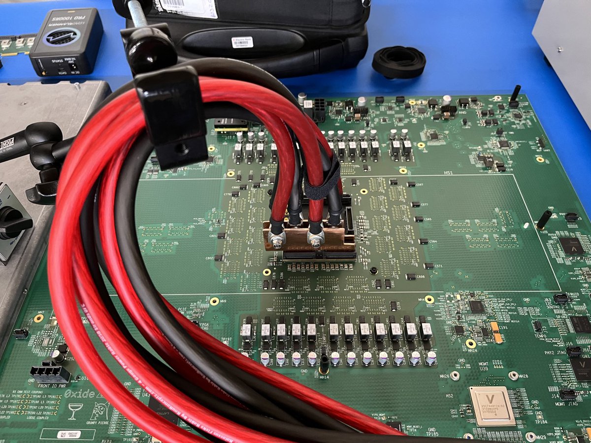 The BGA adapter is shown in the center of the board, connected using thick copper cables to a programmable static load. This load is configured to apply a several hundred amps base load, simulating the ASIC in steady state.