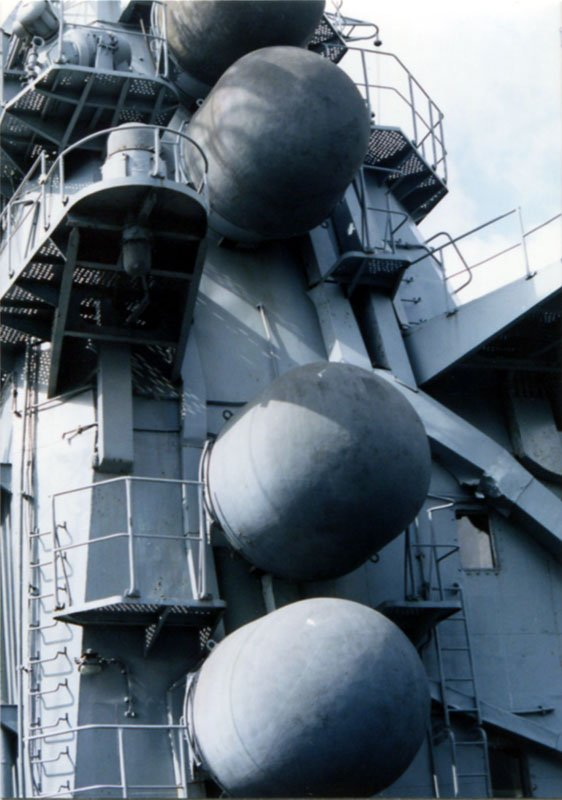 さて巡洋艦モスクワの防御兵装について色々と解説したがソフトキルについて書くのを忘れていた。 まず妨害電波を出すのは8個のレドームで構成されるサイドグローブ(MP150グルズフA)電子戦妨害装置だ。 違うフネの写真だけどね。 (続)