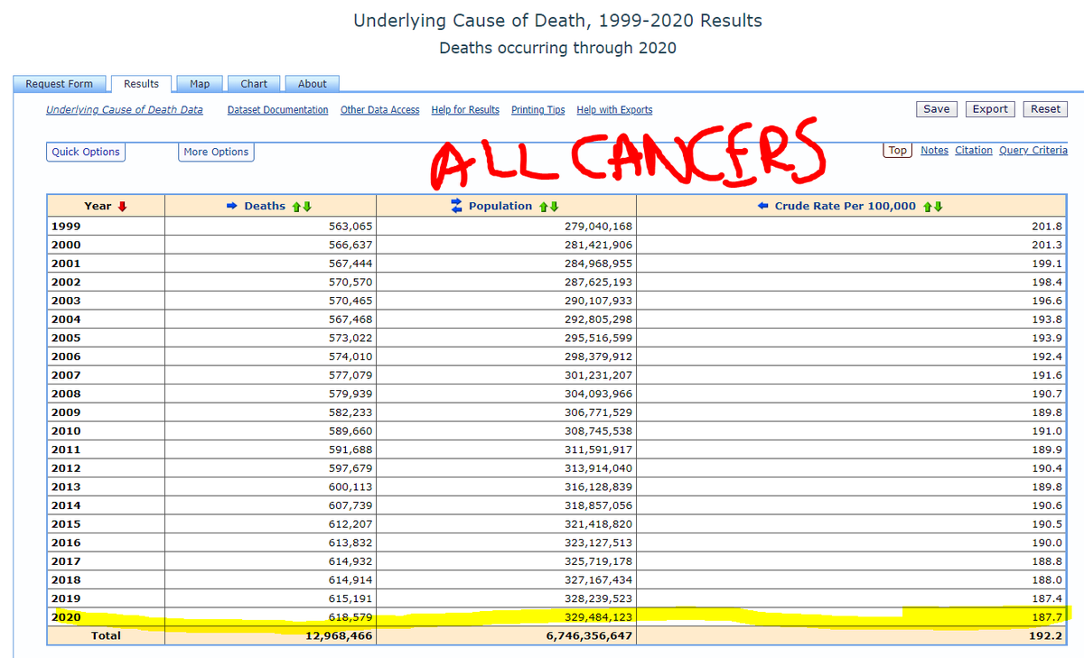 and to be clear, the rate of covid deaths per year since covid started is 159 per 100k per year. The rate of cancer deaths per year is 188 per 100k per year. Adding covid to 2020 had an effect on death AS IF ANOTHER WAVE OF CANCER HAD BEEN ADDED.