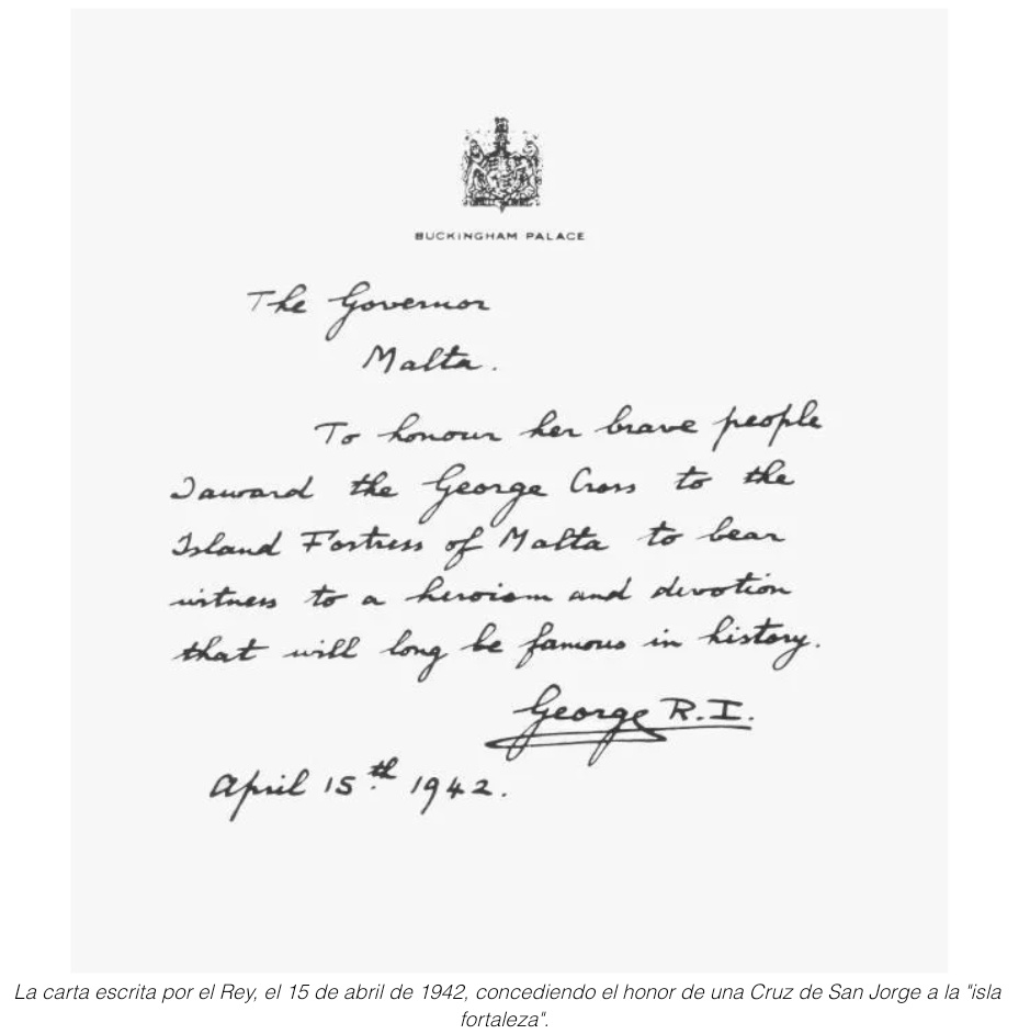 WWII en Twitter 15-Abril-1942 En Malta,el bloqueo🇩🇪🇮🇹y el insistente bombardeo d la Luftwaffe provocó q la situación d la población civil fuese crítica.El abastecimiento d la isla era+q dificil y la invasión parecía inminente.Por ello,el Rey🇬🇧 concedió la Cruz d San Jorge a Malta
