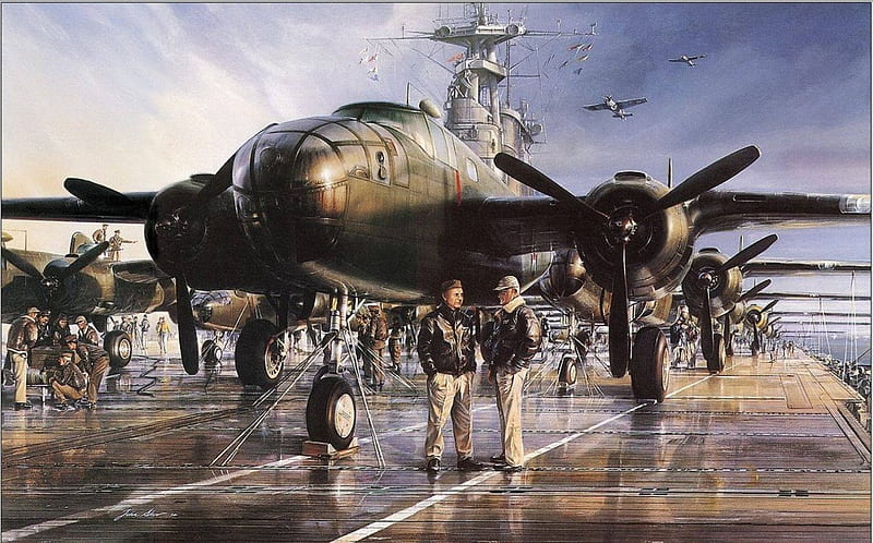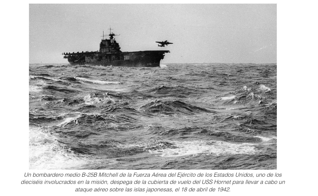 WWII en Twitter 18-Abril-1942 "RAID DOOLITTLE"(la venganza🇺🇸de Pearl Harbour): Una d las misiones+arriesgadas d la IIªGM y q constituyó el primer bombardeo aéreo🇺🇸sobre territorio🇯🇵.Un arriesgado plan para albergar bombarderos B-25 Mitchell a bordo dl portaaviones USS Hornet🎞️,👇