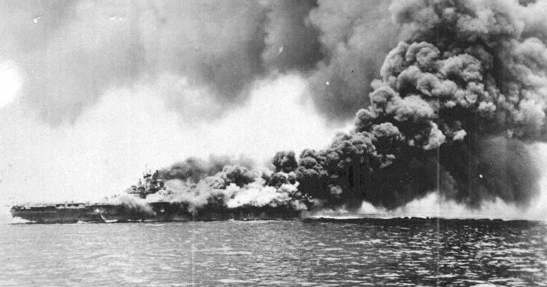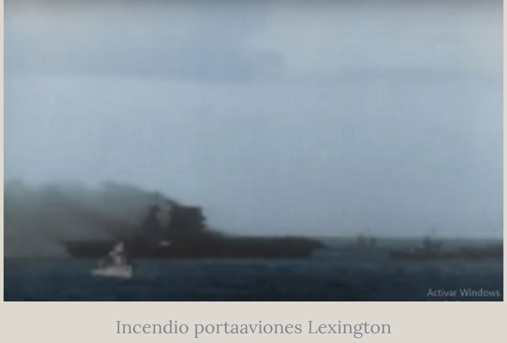 recibió dos torpedos y varias bombas en cubierta,provocando un incendio. Al mediodía,🇯🇵se retira dando la batallax ganada(creían haber hundido los dos portaaviones🇺🇸).El incendio en el Lexington produjo dos explosiones q finalmente obligaron a evacuarlo y hundirlo(mueren 300💂🇺🇸)