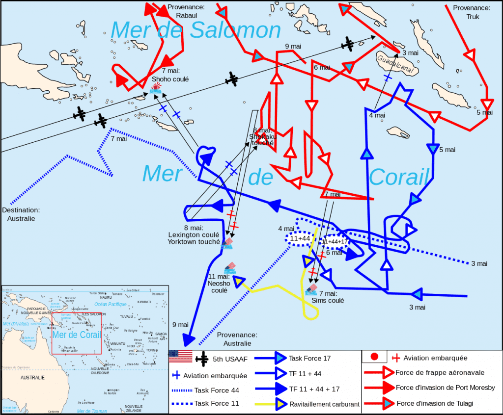 WWII en Twitter 6-Mayo-1942 En el Mar dl Coral,ls flotas🇺🇸🇯🇵se buscan mutuamente sin éxito. La flota🇺🇸constaba d dos portaaviones(Yorktown🎞️y el Lexington🎞️),8 cruceros,13 destructores, 128✈️y 2 petroleros. Los🇯🇵contaban con 3portaaviones(1 ligero)6 cruceros,6 destructores y127✈️