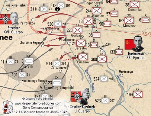 WWII en Twitter 23-Mayo-1942 En Járkov,el 9º y 57⁰ Ejército soviético de Timoshenko intentan parar el avance de las tropas alemanas y lanzan contraataques locales para aliviar varias unidades rodeadas.Pero fracasan y son rodeadas por la Wehrmacht,creándose la bolsa de Izium.