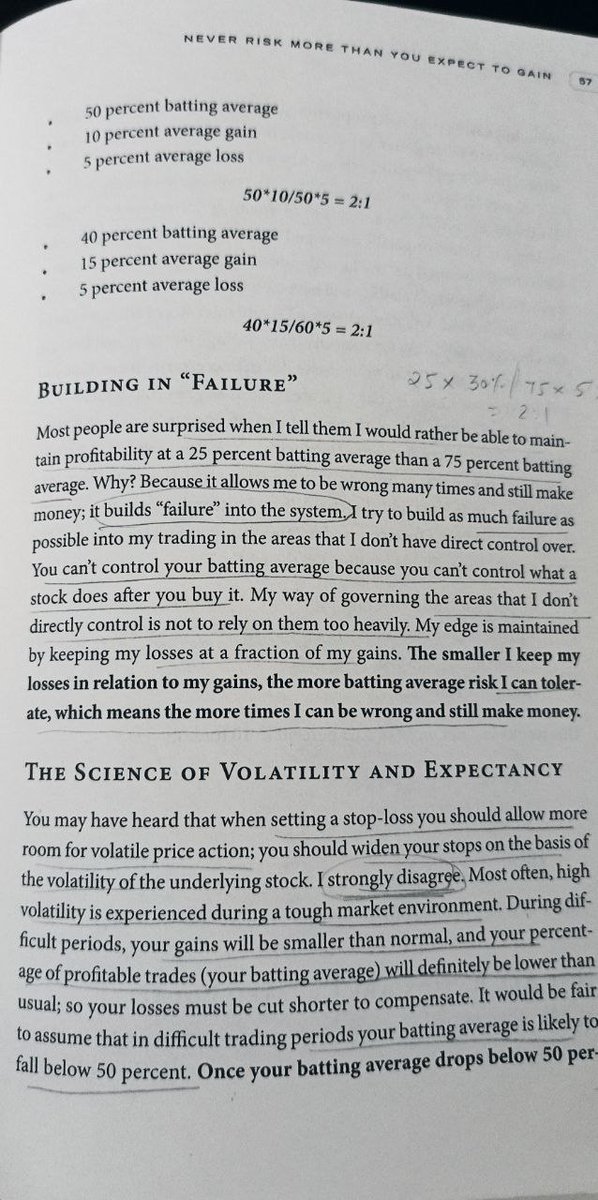 @AdityaTodmal @markminervini 7. Reward to Risk ratio: Lets say you have a 40% winning ratio, and you avg gain % is 15% and avg loss % is 5% Then the Reward/ Risk ratio = 40*15/ 60*5 =2:1 Reference: Think and Trade Like a Champion book by @markminervini (A must read)