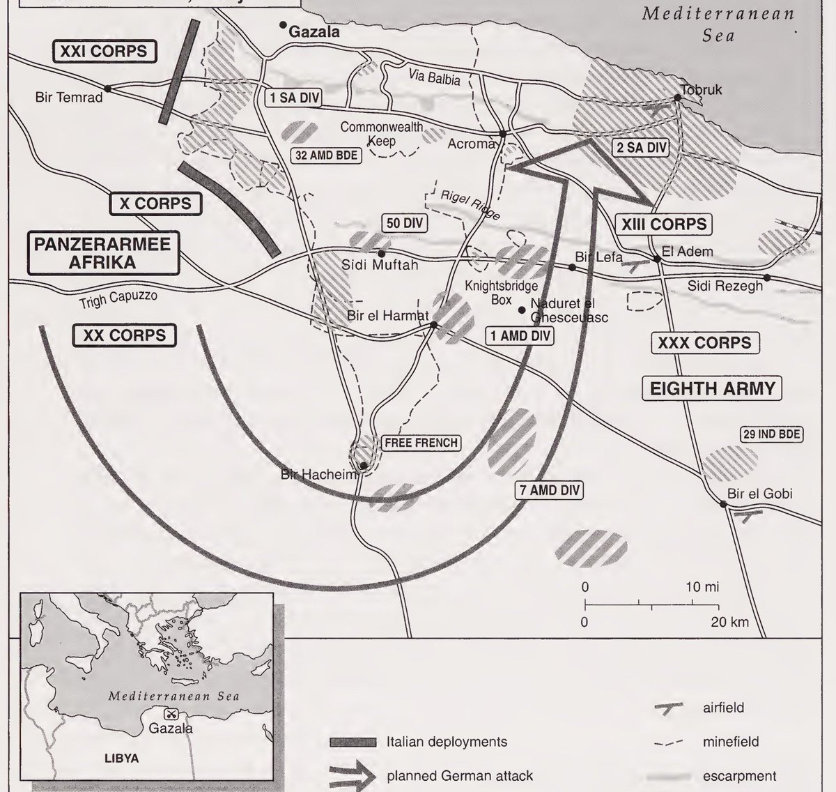 WWII en Twitter 14-Junio-1942 En Libia,Rommel había atravesado la línea defensiva🇬🇧justo en medio de la Línea Gazala. Su AfrikaKorps estaba en dirección al norte-oeste hacia Tobruk.Las fuerzas🇬🇧situadas al este d Tobruk quedaron flanqueadas,por lo q se ordenó una retirada general