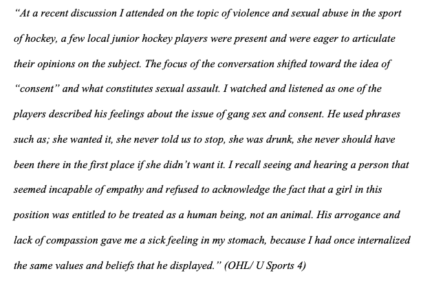 From Ontario Superior Court Filing against the OHL and CHL by a former OHL player #2, "Gang sex (sometimes as many as ten to fifteen players with one female) and violent behaviour, were very much a part of these team gatherings" 14/17