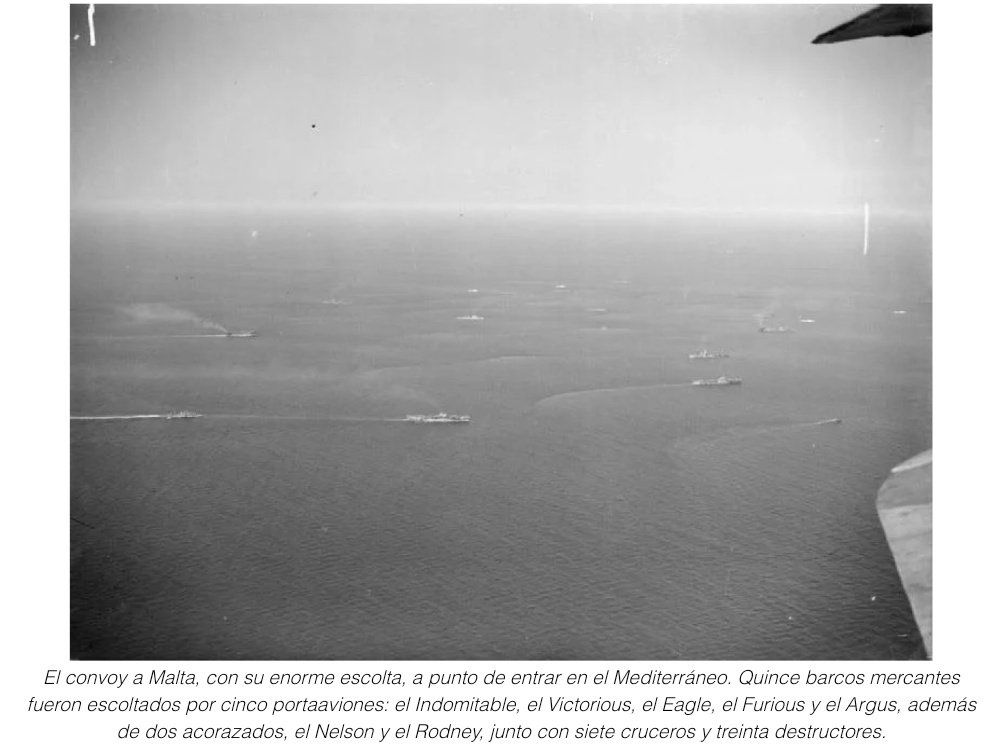 WWII en Twitter 12-Ago-1942 OPERACIÓN PEDESTAL(Abastecer la isla d Malta): A través d un convoy d 14🚢con una escolta d 4 portaaviones,7cruceros,32destructores,4corbetas,4 dragaminas,11submarinos,y🚢 auxiliares.Junto al soporte aéreo d ls portaaviones y bases terrestres d la RAF.