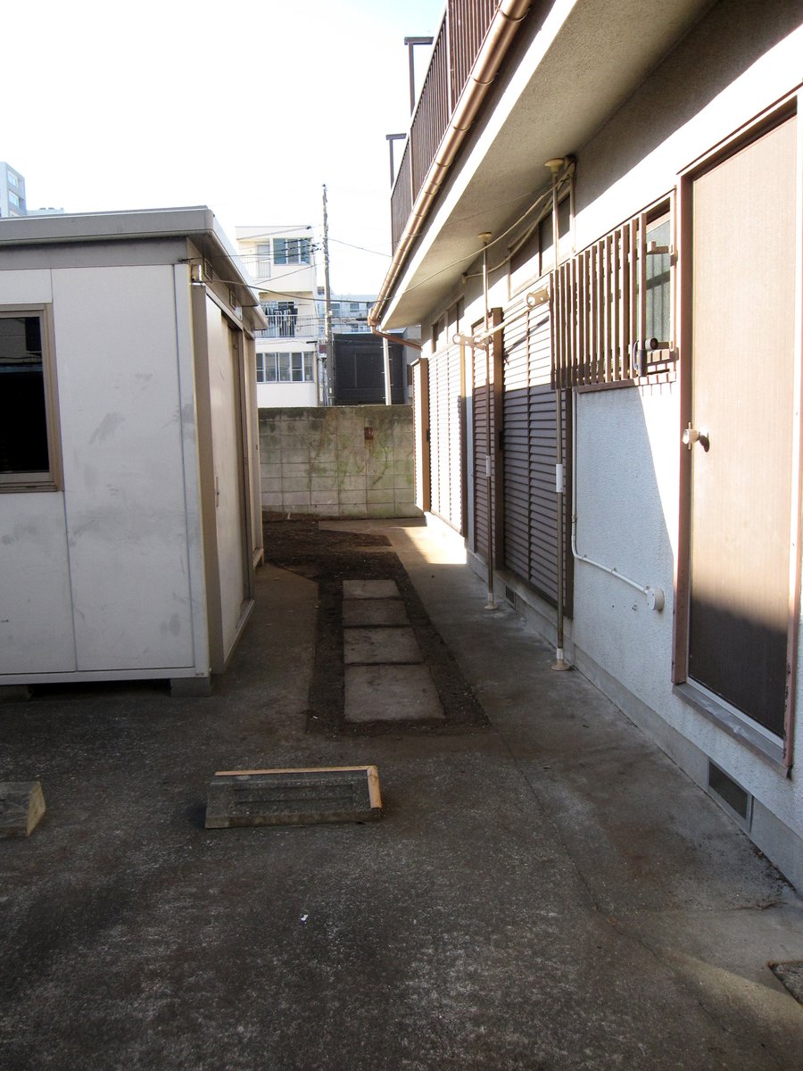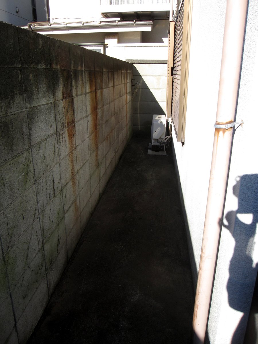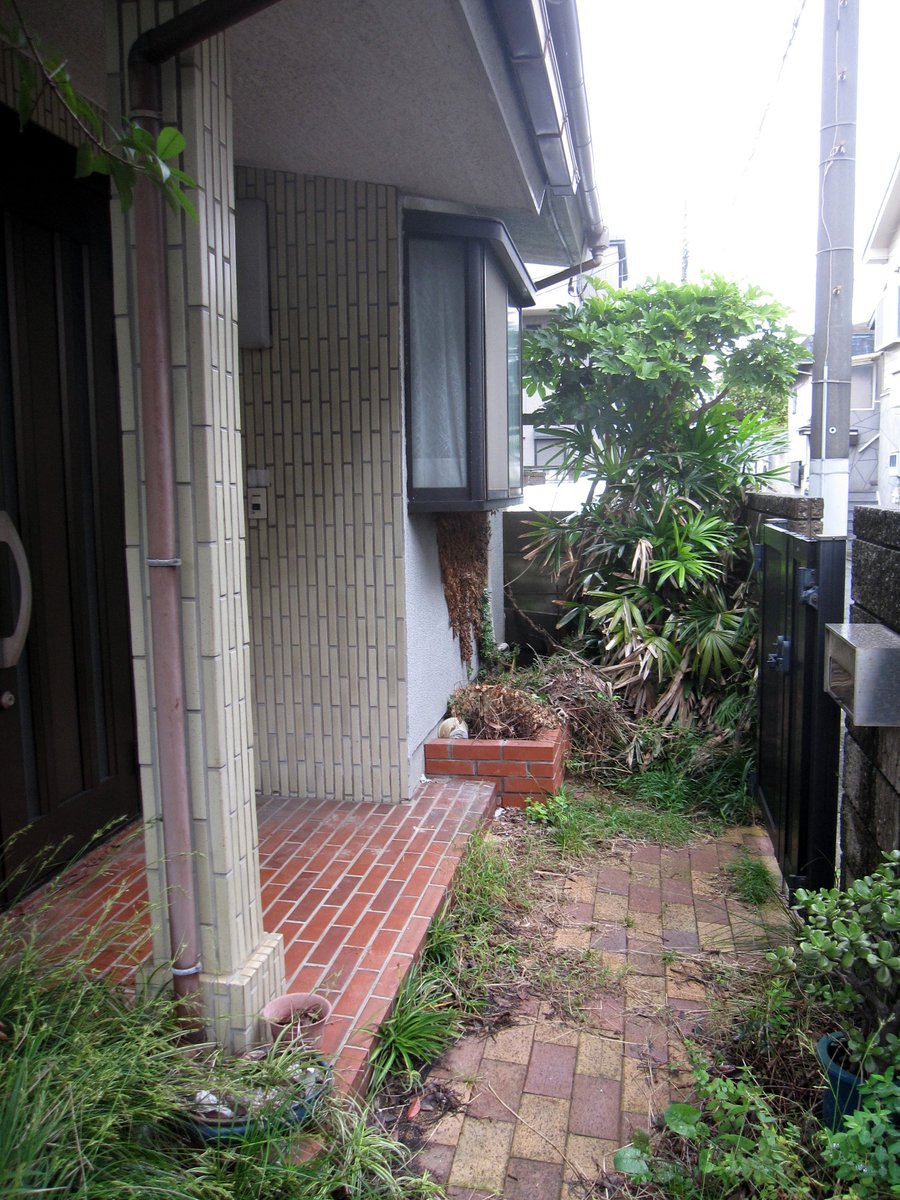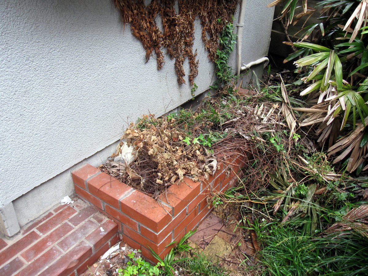 邪魔でない木は枝が伸び放題で落ち葉が堆積してゆく。 このどんどん堆積する落ち葉と小枝がシロアリの温床となる。 更に家と庭の間は狭いコンクリの通路となっておりシロアリに対する防壁となっているのだが此処に放置された伐採された枝がシロアリの巣となる。 更にシロアリは其処から蟻道を作り(続)