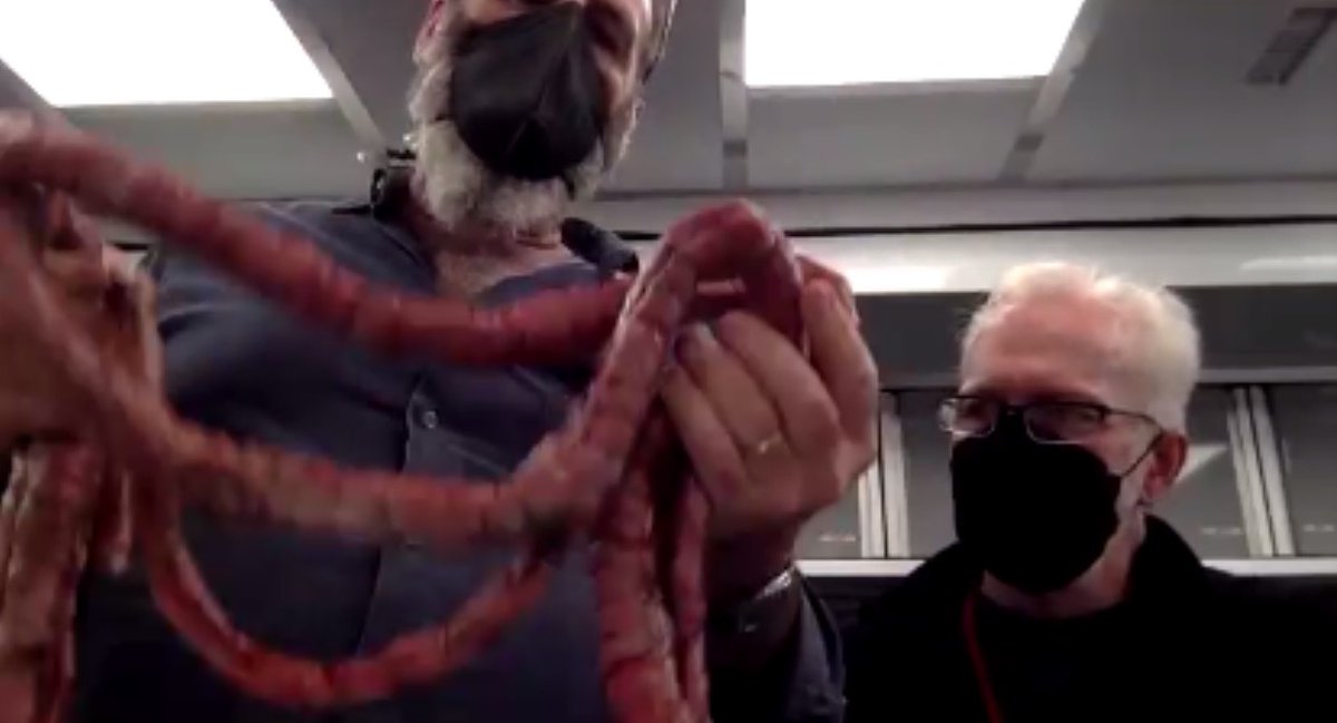 KNB EFX artist Howard Berger & VFX Supervisor Ted Rae with the bloody innards of Alderman Fenwick (played by the amazing @TheJohnDiMaggio aka Bender from Futurama!). KNB has won many awards, working with directors like Sam Raimi, Robert Rodriguez, Quentin Tarantino, & Wes Craven.