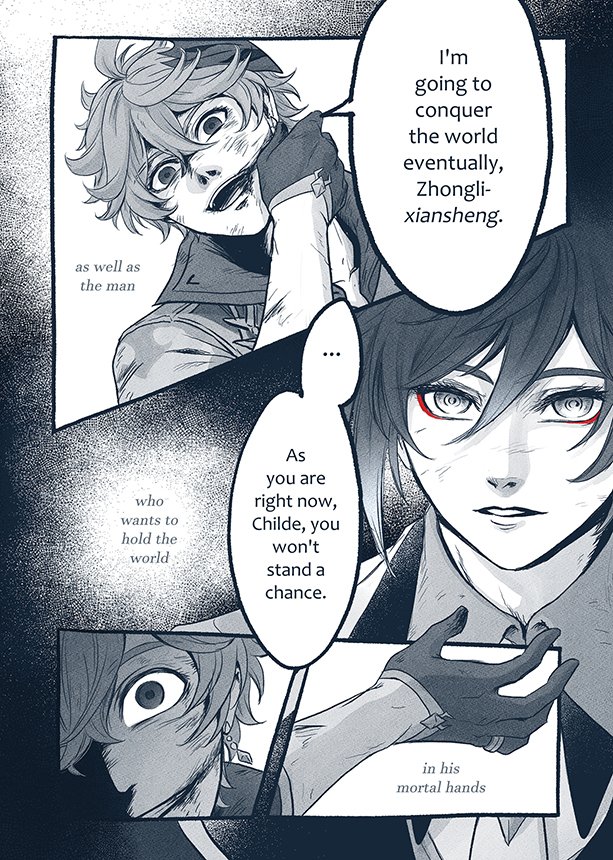 @4dango_the2nd !!! I REALLY LIKE HOW YOU PORTRAY ZHONGLI'S FEELINGS AAGHGH I CAN'T REALLY WORD IT BUT IT'S HOW I ENVISION THEIR RELATIONSHIP!! zhongli captivated by this mortal with a bottomless thirst for more and childe dying at the end it's really the most poetic end for him i love ur comic!