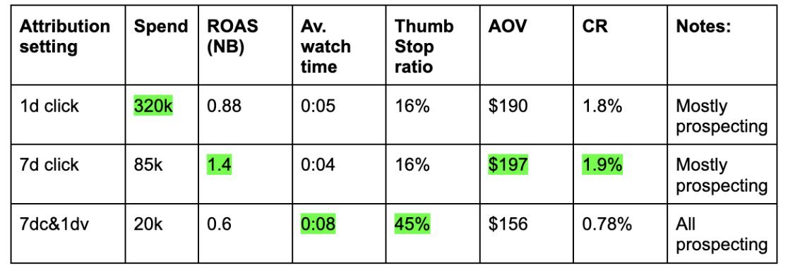 Interestingly 7dc1dv has the highest average watch time and thumb-stop ratio but the lowest AOV and CR After getting back into the ad account I’m noticing there's a VV campaign running, which is causing such a discrepancy in numbers The next step is to turn off the VV campaign