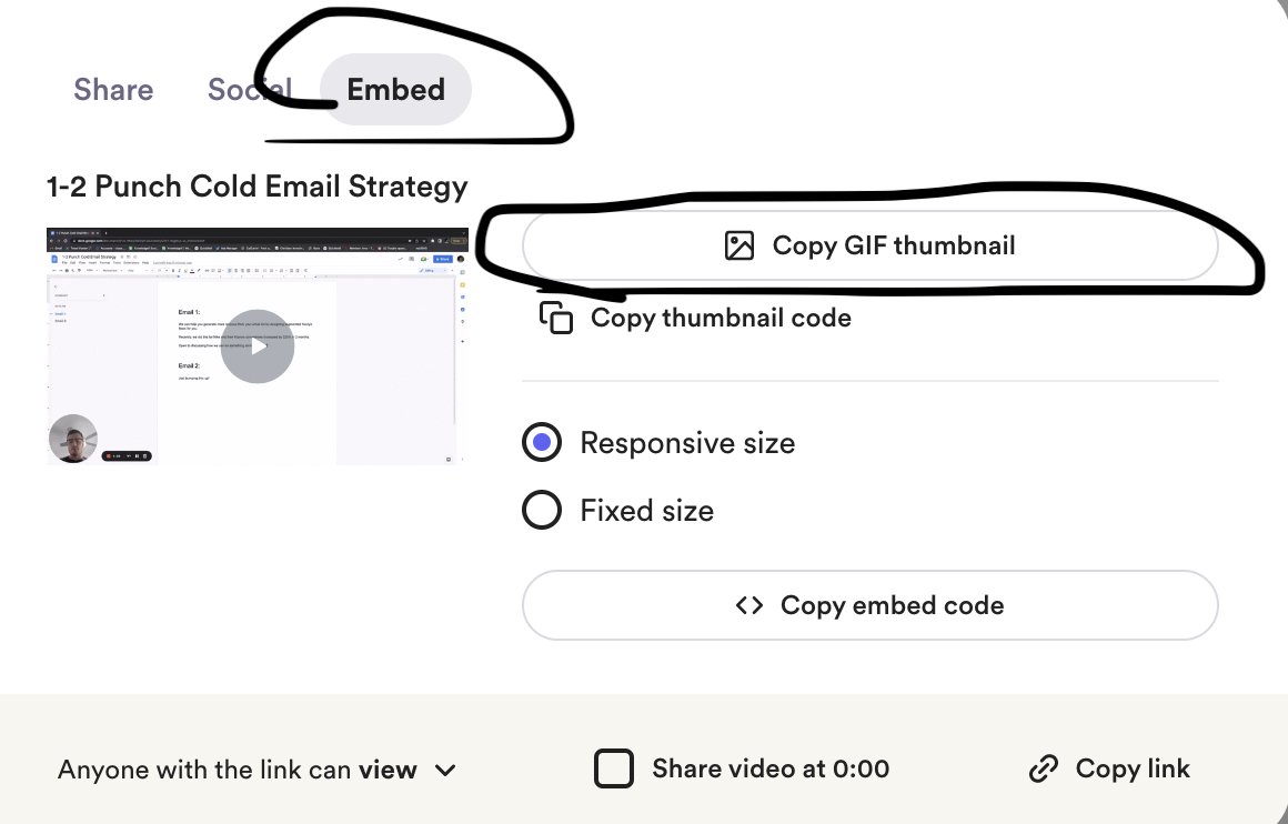 3. Booking a call on the backend Now that the video's recorded, it's KEY that you get the video viewed and responded to. First, make sure you EMBED the Loom thumbnail in your email. - Click the blue "share" button - Click "embed" - Copy the GIF thumbnail