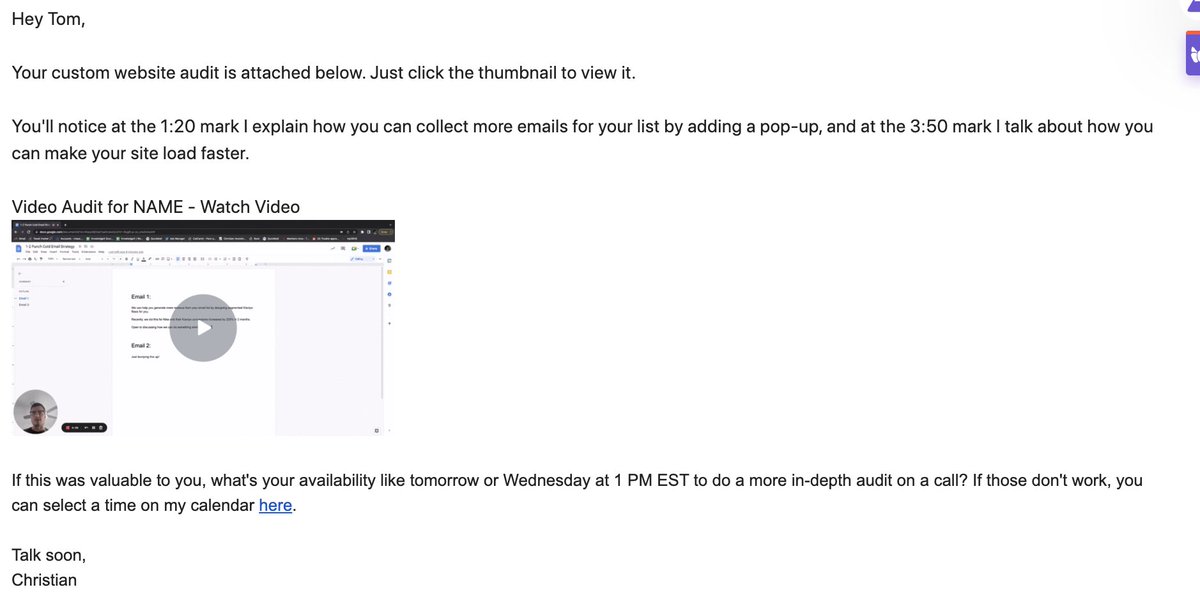 Once you finish talking through the 3 points, wrap the video with a strong CTA: "If this was valuable to you, let me know when you have a few minutes for a quick call so we can run through a more in-depth audit of your site together" The video should be 5 minutes max.