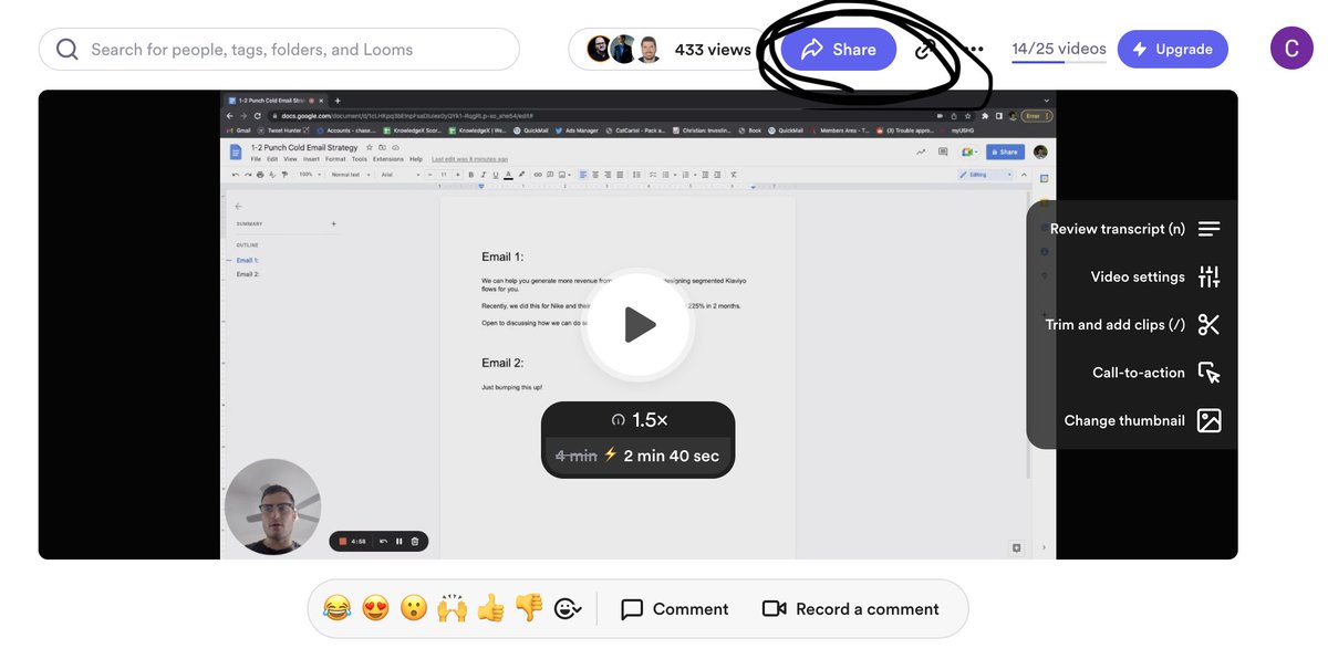 2. Record the audit using Loom The beauty of this strategy is you only need to record a website for WARM prospects... Prospects that reply to your email saying "yes" to your video request. Once you get a "yes", IF they're qualified, pull up their website and fire up Loom.