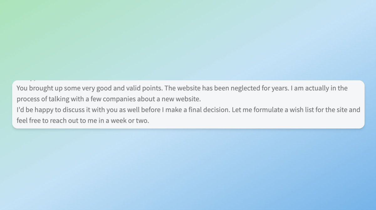 1. Pitching a website audit in your email To be completely honest, web design is a TOUGH offer to sell over cold email... Which is why you need to sell the AUDIT in your email instead of your SERVICES. To sell the audit, the only part of your email that changes is the CTA.