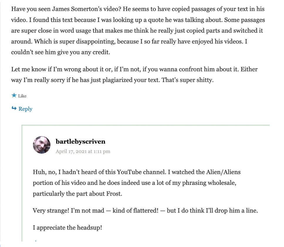 I've been told there are 4-5 instances of plagiarism where he lifted extended parts of other videos or essays wholesale. I dunno why, but I've been thinking a lot about creators taking credit for others' work for personal recognition and money.