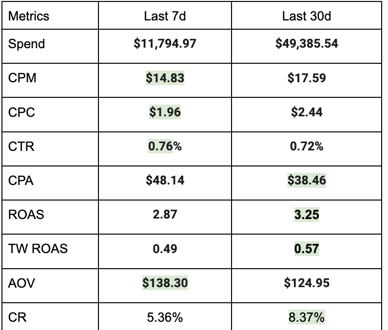 The first things I noticed are 1. massive misalignment of FB and TW ROAS I know the product is expensive, but there’s clearly massive over-attribution on FB, probably cause by running on 7dc1dv 2. Fluctuation of CR and AOV between last 7 and 30d