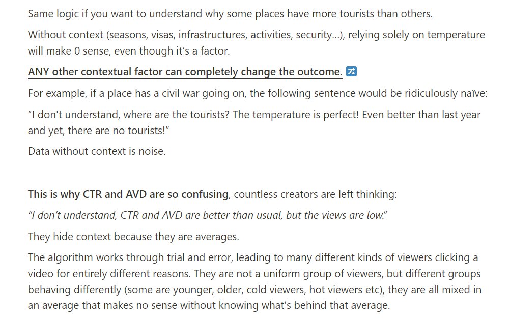 "Ofc youtube provides context, you have other metrics!" I'm not talking about that context. (Because if we talk about that context, views are 100x better for signal) I'm talking about context BEHIND these metrics (CTR/AVD).